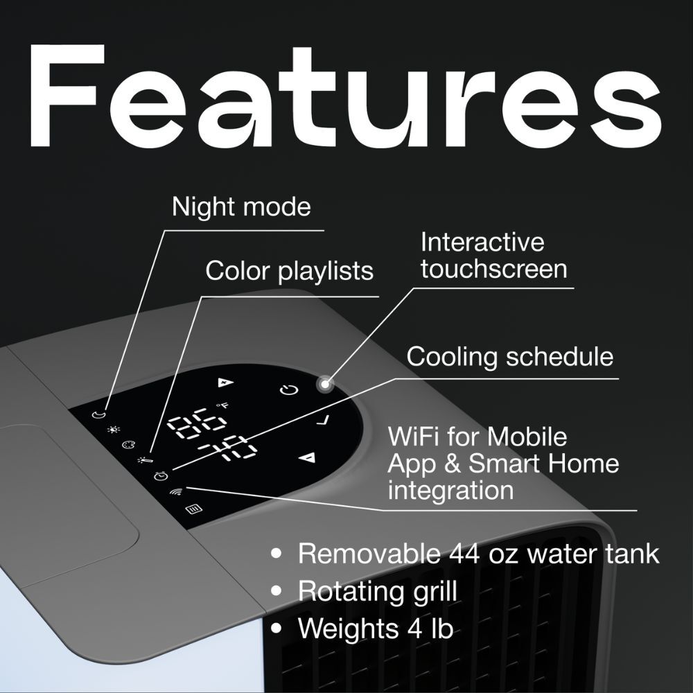 - 3-IN-1 COOLING Evapolar evaSMART cools & humidifies the air using evaporative technology, the cartridge material also catches large dust particles. evaSMART mini air conditioner is equipped with a removable water tank (44 oz capacity) full-spectrum LED light and can be controlled via mobile app or smart home services.